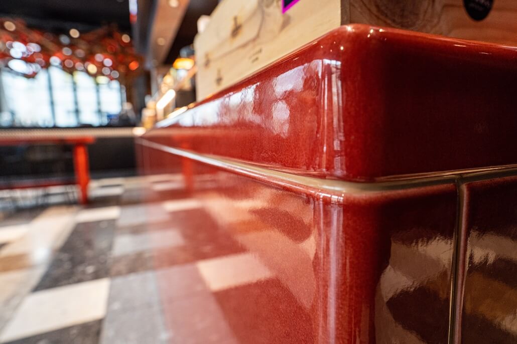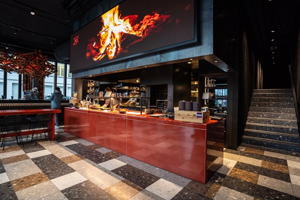 Pour le projet 1Komma7 Grill & Bar, Pyrolave a réalisé des surfaces en lave émaillée sur mesure, intégrées au cœur d’un espace où design contemporain et atmosphère chaleureuse se rencontrent.