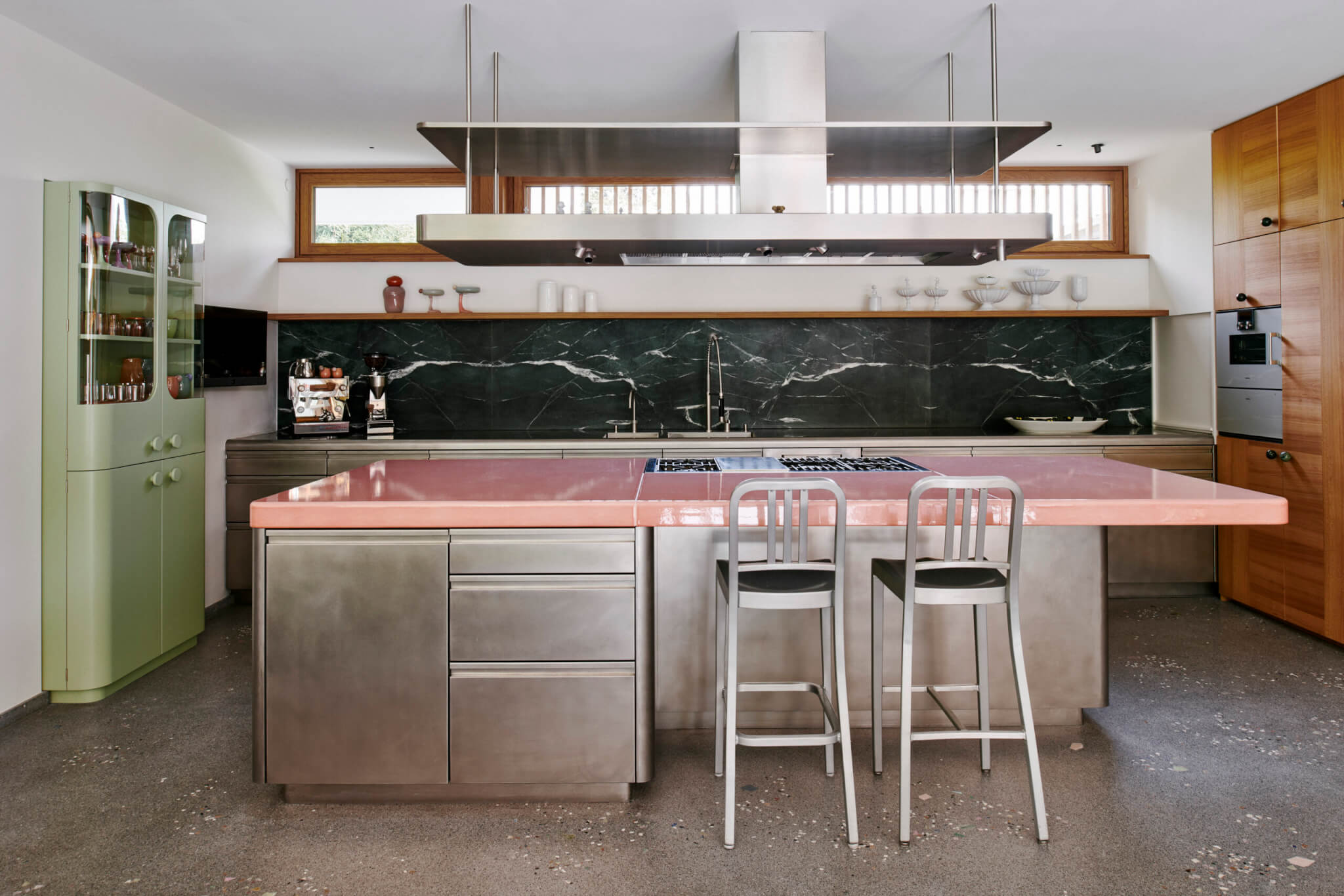 Façonnée dans nos ateliers, la lave émaillée Pyrolave révèle ici toute sa richesse : une surface dense, lisse et brillante, capable de capter la lumière et de souligner avec finesse les lignes architecturales de l’îlot.